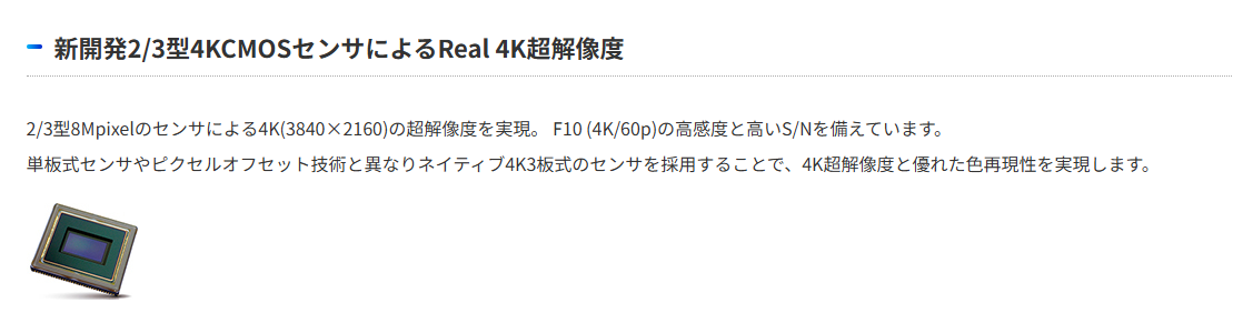 ーグローバルシャッタ対応CMOSセンサ採用により、ローリングシャッターによる歪みやフラッシュバンドのない自然な4K高画質映像を再現