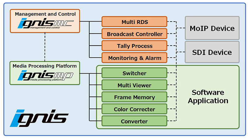 该软件平台在通用服务器上执行媒体信号处理。通过运行具有各种功能的应用程序,例如切换台和多画面分割器,可以实现实时视频和音频制作。