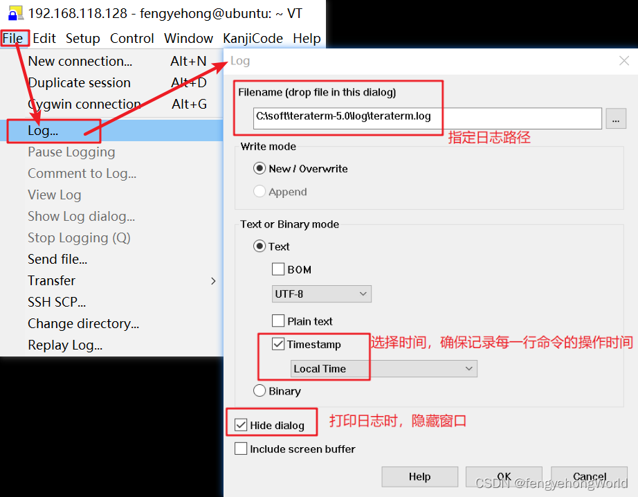 点击File后,选择Log可以将当前的linux操作记录保存到指定位置的log中。