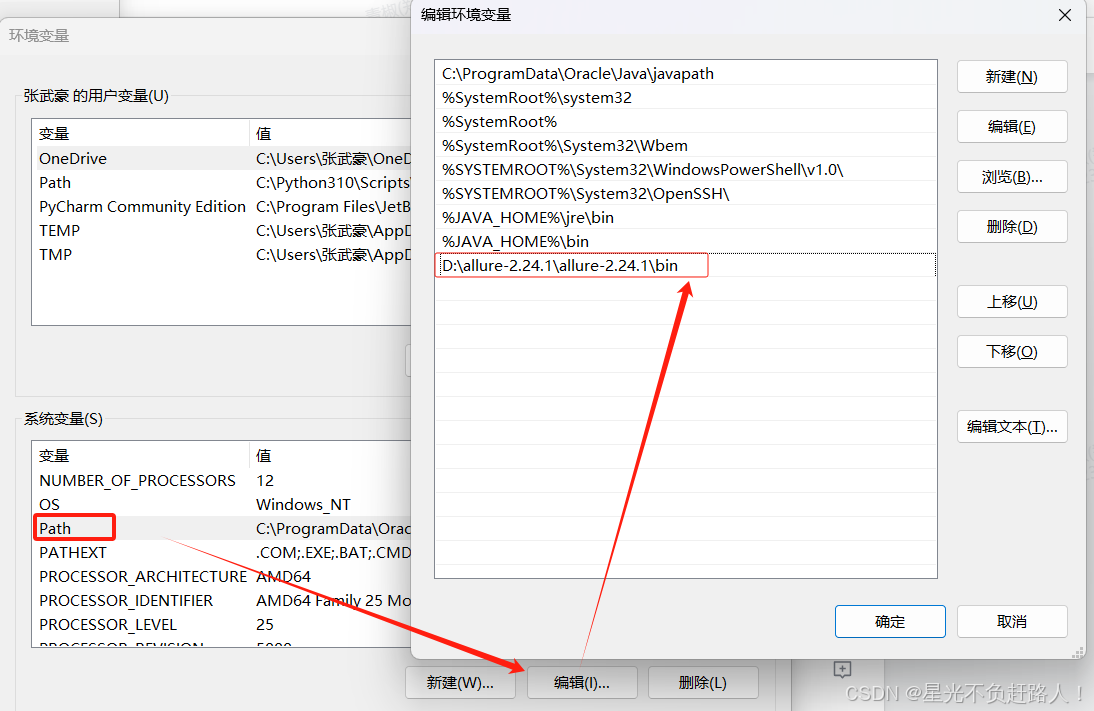 在本地解压下载好的allure包,解压后有4个文件夹,复制bin文件夹目录路径,并用其设置allure环境变量,添加到Path变量中: