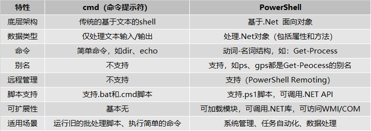PowerShell的功能更强大,涉及对象、管道、脚本编程,学习成本更高。CMD命令简单,用户只需要记住一些基本命令(如: