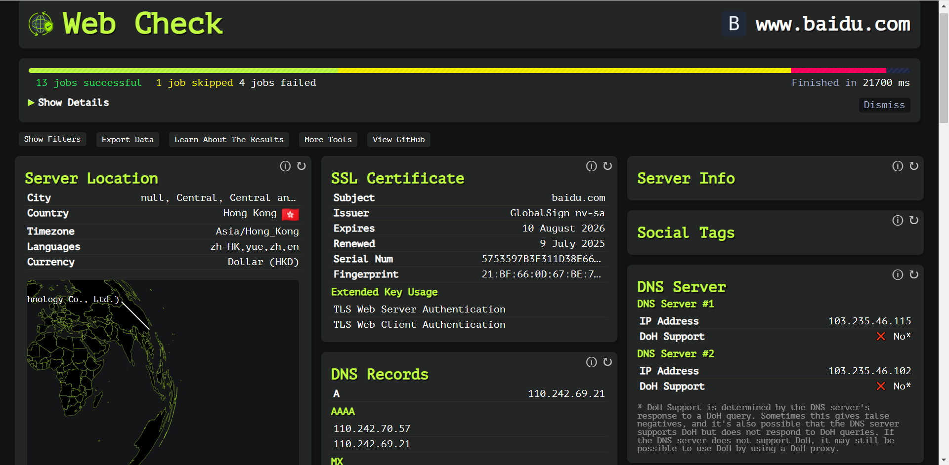 网站追踪:web-check 可以分析一个网站的基本信息,包括网站的域名注册信息、服务器信息、IP 地址等,帮助用户追踪一个网站的来源和所属公司或个人。