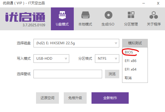 制作完成后,测试是否制作成功,点击模拟测试>BIOS